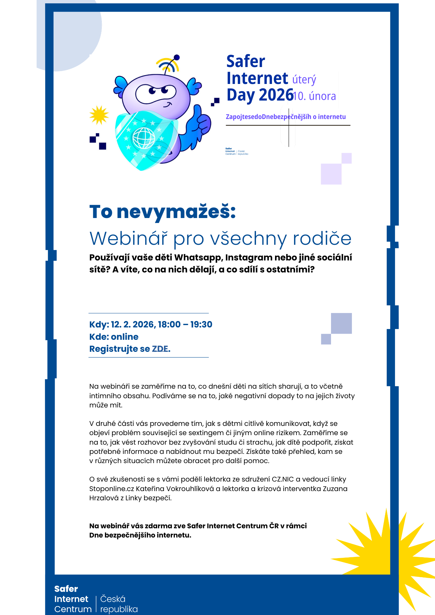 Zaregistrujte se na online webinář, který pořádá Safer Internet Centrum ČR v rámci Dne bezpečnějšího internetu 12. 2. 2026, 18:00 – 19:30.